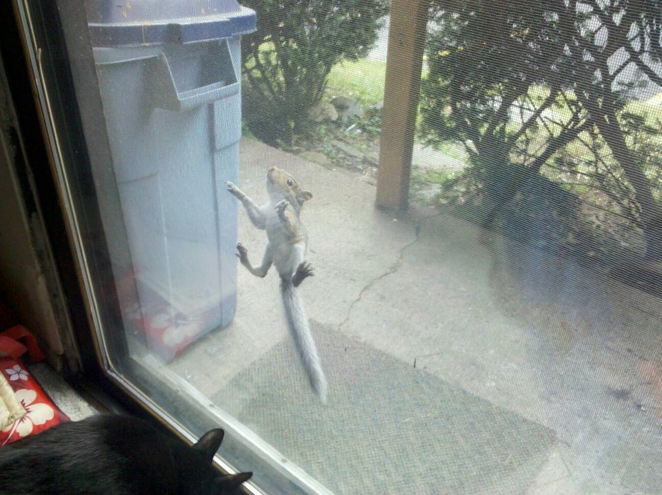 He is wicked cute…and really drove my cats bonkers! I tried to catch him on Wednesday, but he disappeared before I could grab gloves and a cat carrier. I was literally in a feverish haze, sweating through my clothes, wandering around outside all around my apartment trying to find the little guy. I couldn’t find him, but I called a couple of animal rescue places and they all told me that the best thing to do would be to get him into a tree or a more wooded area if I could. Since he was fully furred and had a bushy tail, they all told me he should do fine on his own.